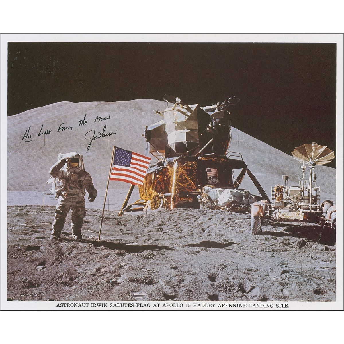 Color 10 x 8 NASA photo of Irwin saluting the American flag on the lunar surface, signed in black felt tip beneath a pre-printed sentiment. A crease to lower right corner, otherwise fine condition.