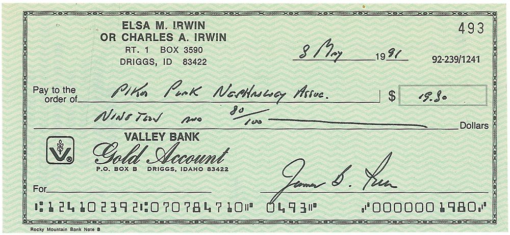Personal check, 6 x 2.5, filled out and signed by Irwin, “James B. Irwin,” payable to Pikes Peak Nephrology Assoc. for $19.80, May 8, 1991. In fine condition.