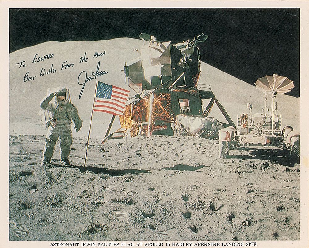 Color 10 x 8 NASA photo of Irwin saluting the flag on the lunar surface, signed and inscribed in black felt tip “To Edward, Best wishes from the Moon, Jim Irwin.” In fine condition, a couple mild corner creases.