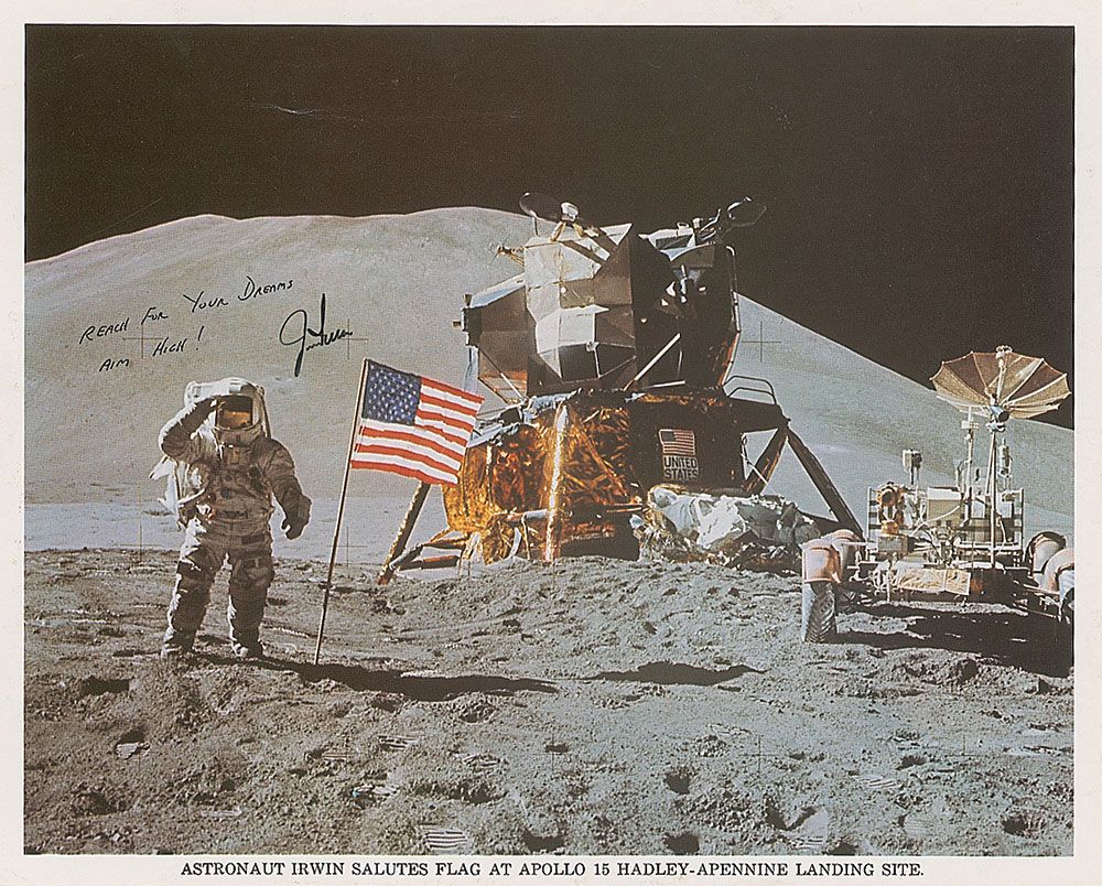 Color 10 x 8 NASA photo of Irwin saluting the flag on the lunar surface, signed in black felt tip beneath a pre-printed sentiment. In fine condition, with a couple slight bends.