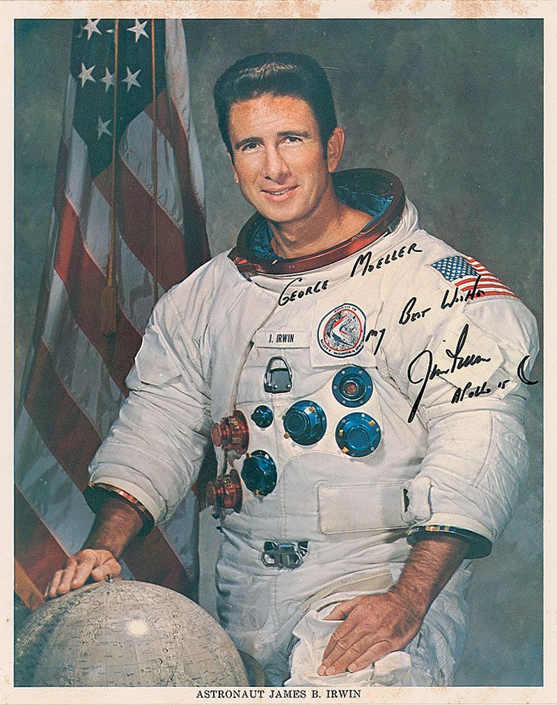Color 8 x 10 NASA photo of Irwin in his white space suit, signed and inscribed in black felt tip, “George Moeller, my best wishes, Jim Irwin Apollo 15,” adding a small crescent moon sketch. Scattered foxing to borders, otherwise fine condition. Accompanied by a certificate of authenticity from James Spence.