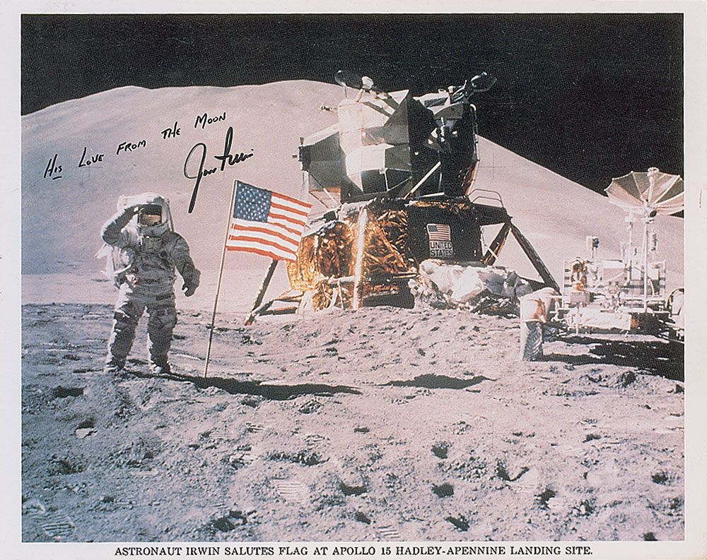 Color 10 x 8 NASA litho of Irwin saluting the American flag on the lunar surface, signed in black felt tip beneath a pre-printed sentiment. In very fine condition.