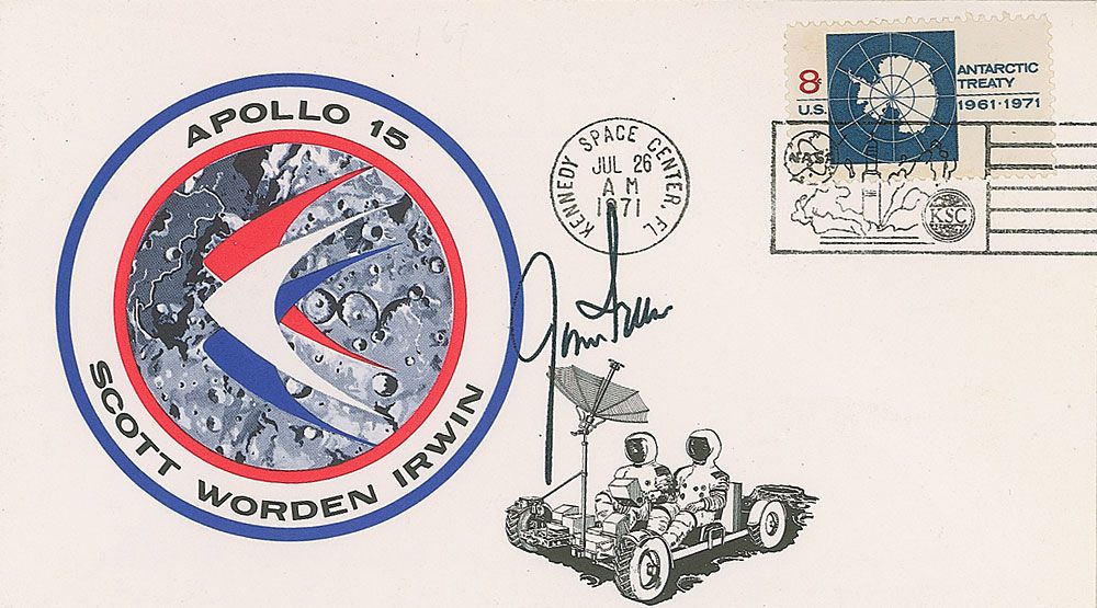 Apollo 15 launch day cover with a cachet of the mission insignia and an image of a lunar rover, signed in black felt tip by Irwin. In very fine condition.