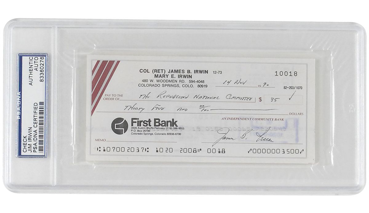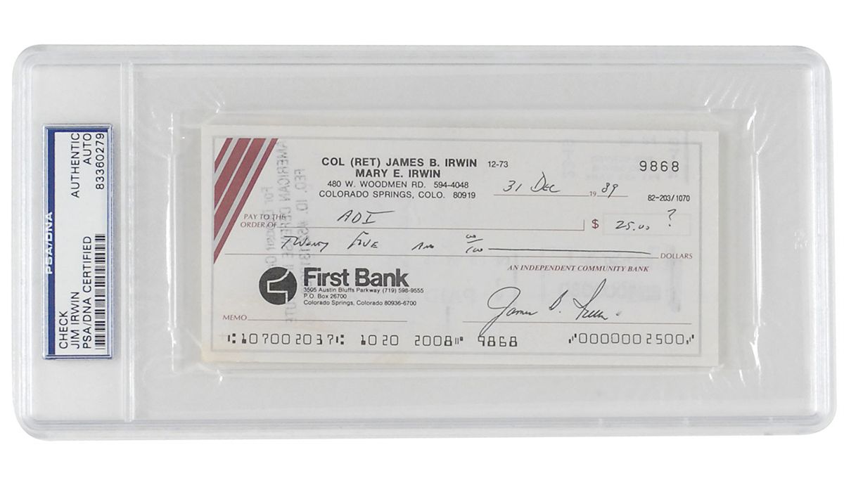 Two personal checks, 6 x 2.75, each filled out and signed by Irwin, “James B. Irwin,” dated 1989 and 1990. Each is encapsulated in a plastic PSA/DNA authentication holder. In fine condition, with light show-through from stamps under signature.