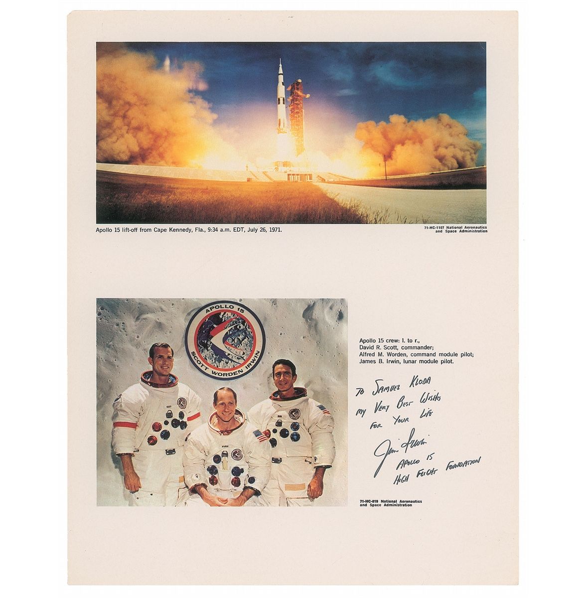 Color 11 x 14 composite NASA print of the Apollo 15 crew and the their mission’s lift-off, signed and inscribed in black felt tip, “To Samuel Kloda, my very best wishes for your life, Jim Irwin, Apollo 15, High Flight Foundation.” In fine condition, with light creases to the corners.