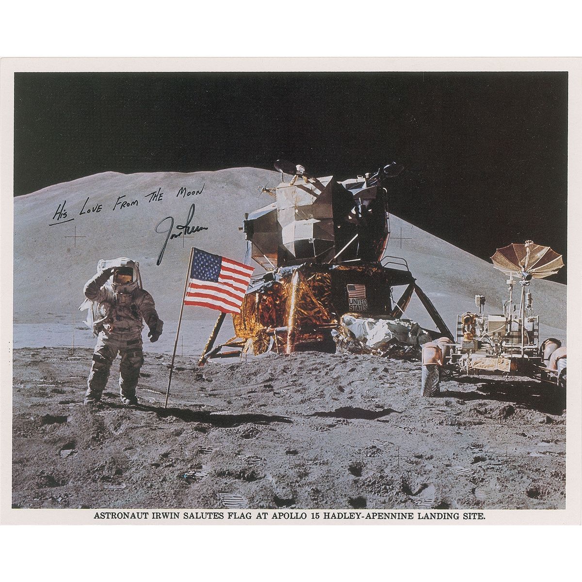 Official color 8 x 10 NASA lithograph of Irwin saluting the American flag on the lunar surface, signed in black felt tip below a pre-printed sentiment. In very fine condition.