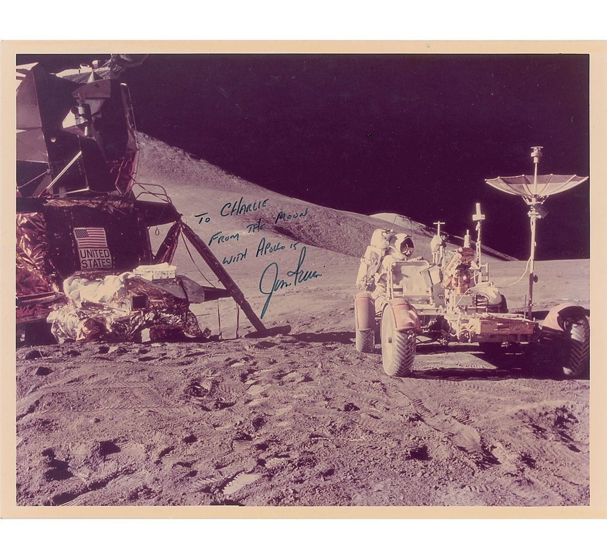 Official color glossy 10 x 8 NASA photo of Irwin with the Lunar Roving Vehicle during an EVA, signed and inscribed in black felt tip, “To Charlie, from the Moon with Apollo 15, Jim Irwin.” In fine condition, with mild uniform toning.
