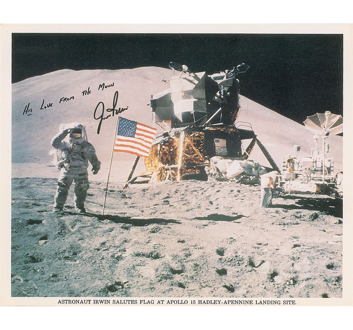 Color 10 x 8 cardstock photo of Irwin saluting the American flag at the Apollo 15 landing site, signed in black felt tip below a pre-printed sentiment. In fine condition.