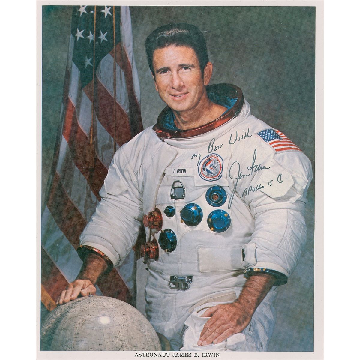 Supremely rare official color 8 x 10 NASA lithograph of Irwin posing in his white space suit, signed in black felt tip, “My best wishes, Jim Irwin, Apollo 15,” and adding a small sketch of a crescent moon. In fine condition. Accompanied by a full letter of authenticity from Steve Zarelli. Irwin white space suit portraits are easily the rarest of any of the moonwalkers and are seldom seen uninscribed.