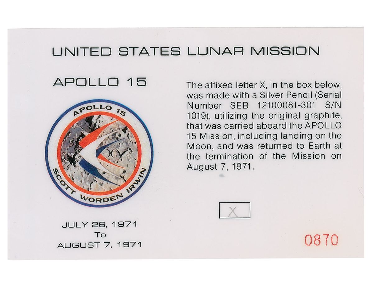 A graphite pencil “X” made with a flown silver pencil carried on board the Apollo 15 mission. Mark is made on a 5.75 x 3.75 card, which reads, in part: “The affixed letter X…was made with a Silver Pencil (Serial Number SEB 12100081-301 S/N 1019) utilizing the original graphite that was carried on board the Apollo 15 mission.” Card has been professionally protectively laminated. Accompanied by a photocopied letter of authenticity from Irwin stating the pencil was carried to the moon. In fine condition.