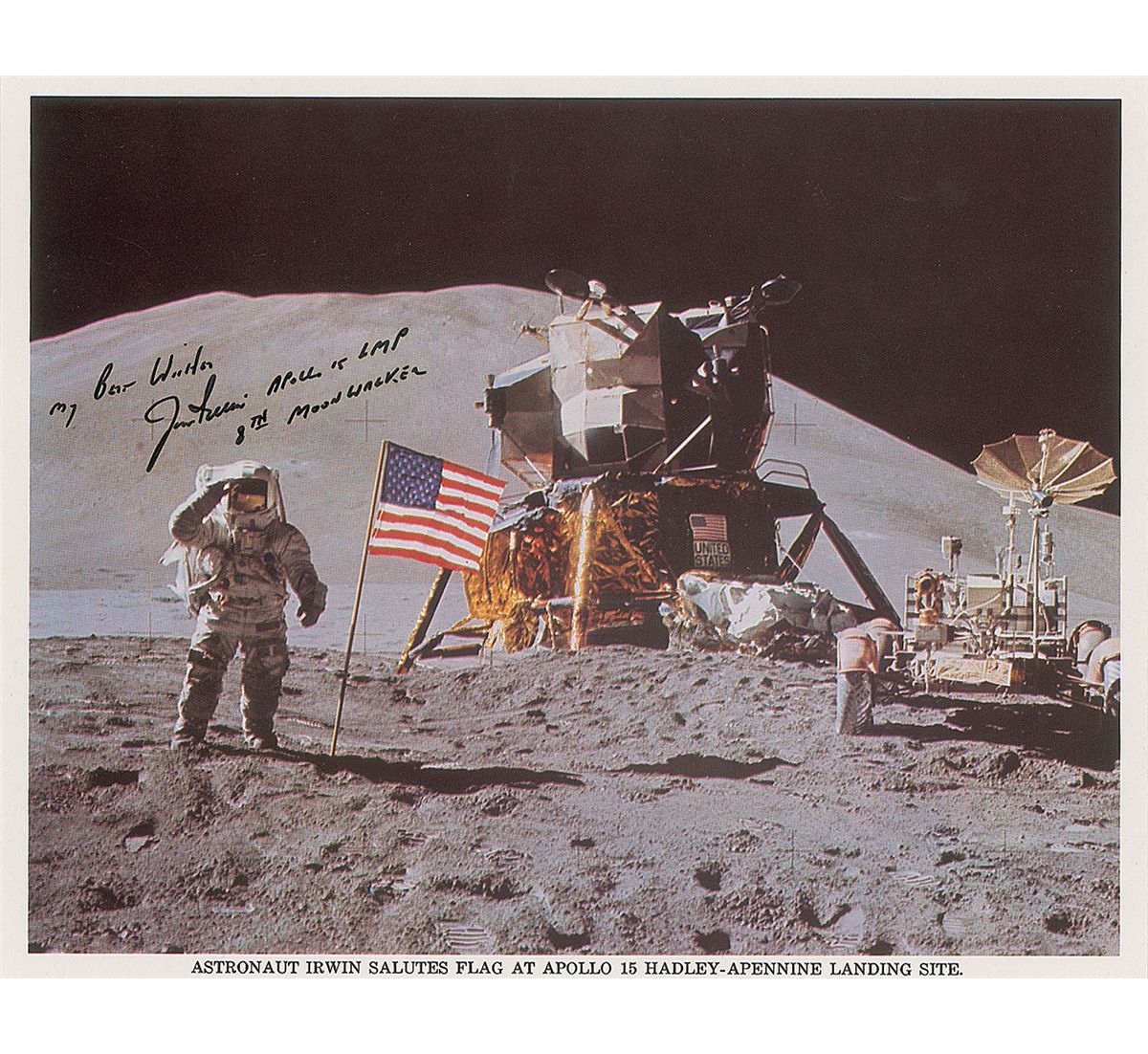 Official color 10 x 8 NASA lithograph of Irwin saluting the American flag on the lunar surface, signed in black felt tip, “My best wishes, Jim Irwin, Apollo 15 LMP, 8th moonwalker.” In fine condition, with some light haloing around signature and sentiment.