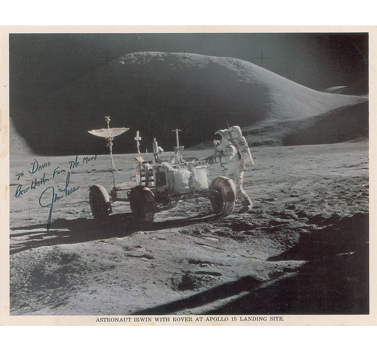 Official color 10 x 8 NASA lithograph of Irwin with a Lunar Rover at the Apollo 15 landing site, signed and inscribed in black felt tip, “To David, Best wishes from the Moon, Jim Irwin.” In very good condition, with scattered creases and soiling to the left edge.