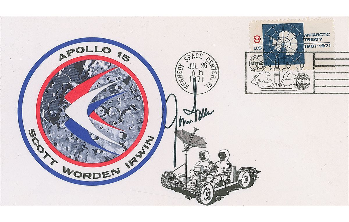 Apollo 15 launch day cover with a cachet of the mission emblem, signed in black felt tip by Irwin. Notation on the reverse of cover reads, “Irwin autograph obtained in person at Ocean Grove Auditorium New Jersey Aug 3, 1980. A.J. Cipriano.” In fine condition. Cipriano, a member of the National Space Institute and the American Institute of Aeronautics and Astronautics, wrote the 1979 book America’s Journeys Into Space: The Astronauts of the United States.