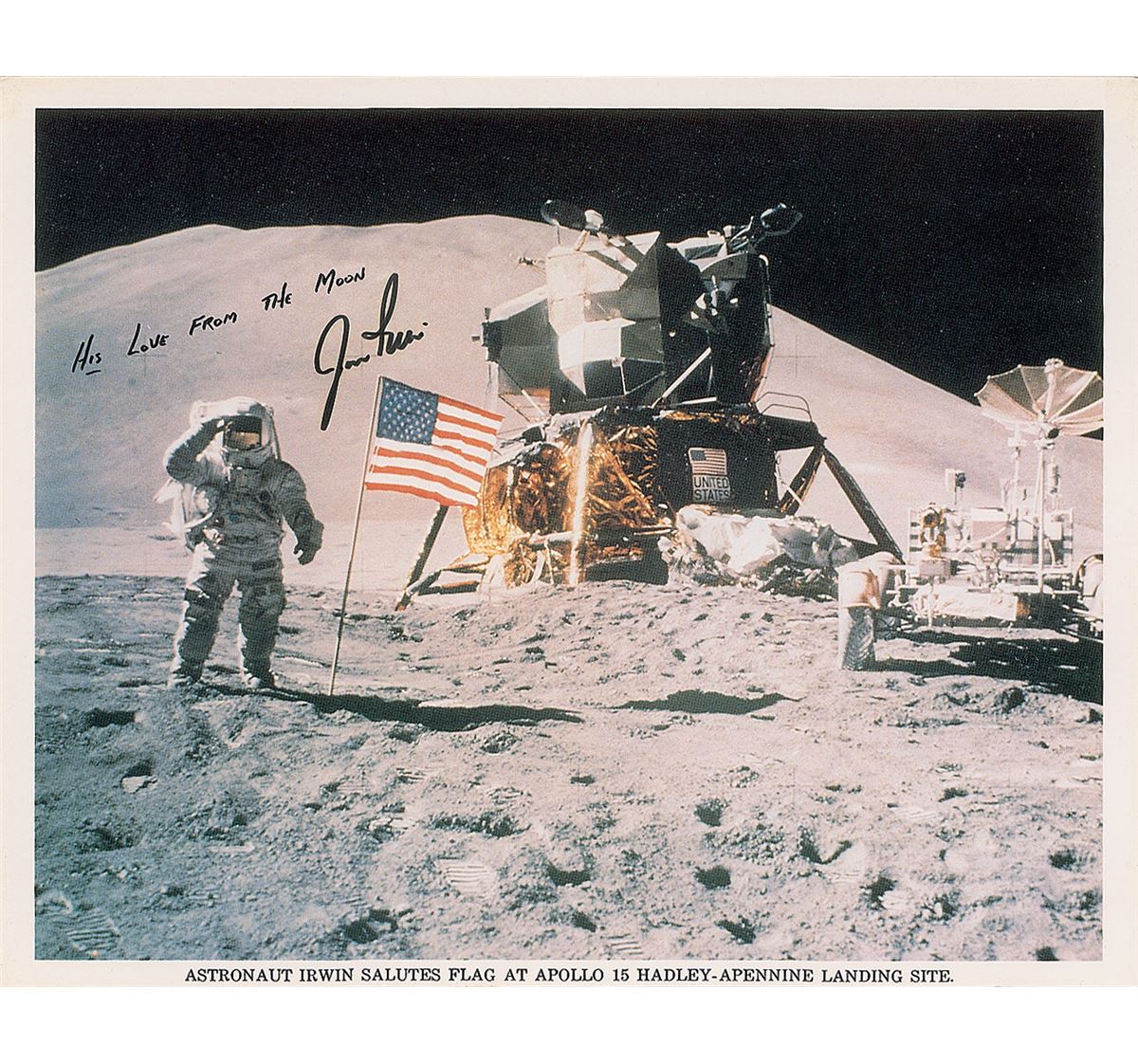 Official color 10 x 8 NASA lithograph of Irwin saluting the flag at the Apollo 15 Hadley–Apennine landing site, signed in black felt tip, “His love from the moon, Jim Irwin.” In fine condition.