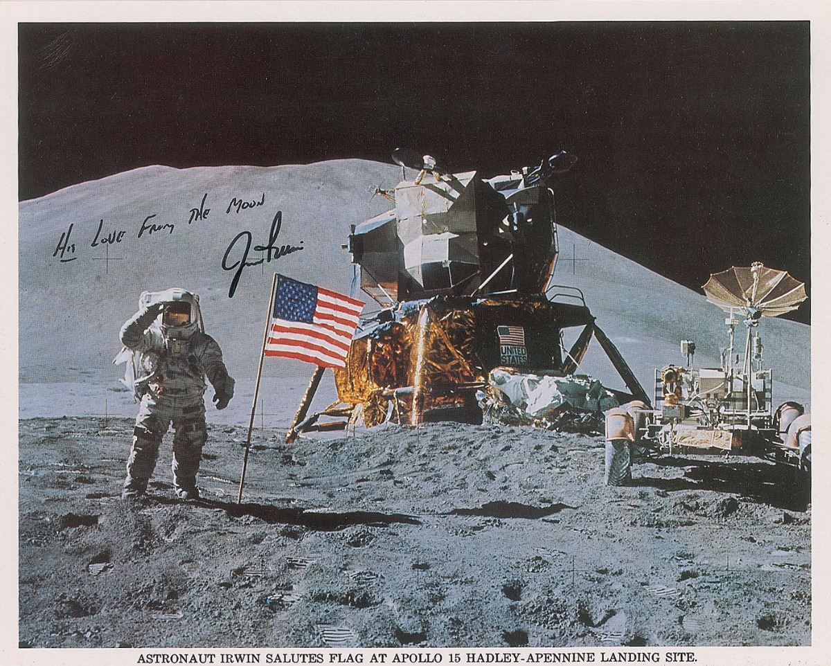 Official color 10 x 8 NASA lithograph of Irwin saluting the American flag at the Apollo 15 landing site, signed in black felt tip below a pre-printed sentiment. In fine condition.