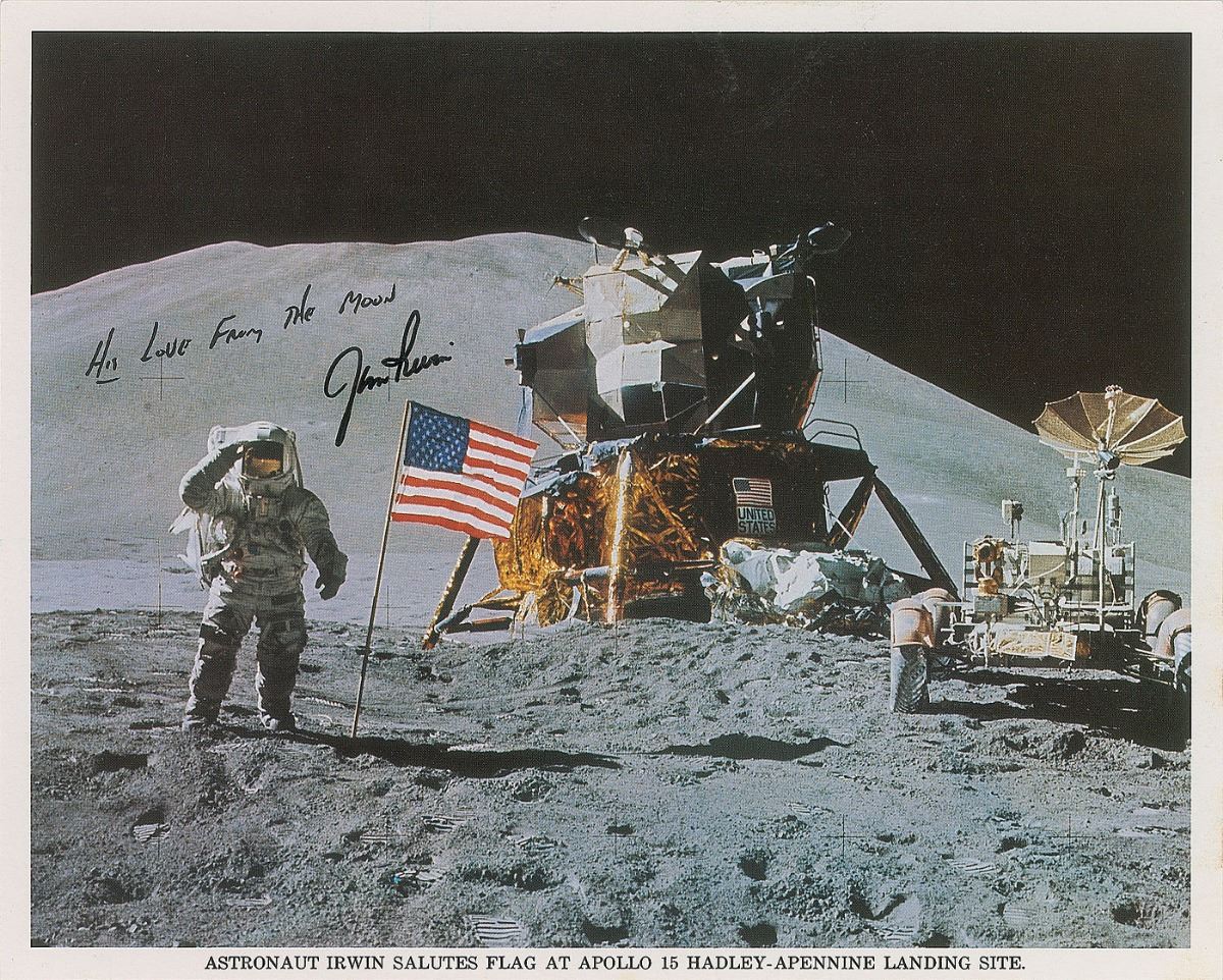 Official color 10 x 8 NASA lithograph of Irwin saluting the American flag on the lunar surface, signed in black felt tip, “Jim Irwin,” with a printed sentiment above the signature. In fine condition. Accompanied by an unsigned ‘Footprints on the Moon’ booklet.