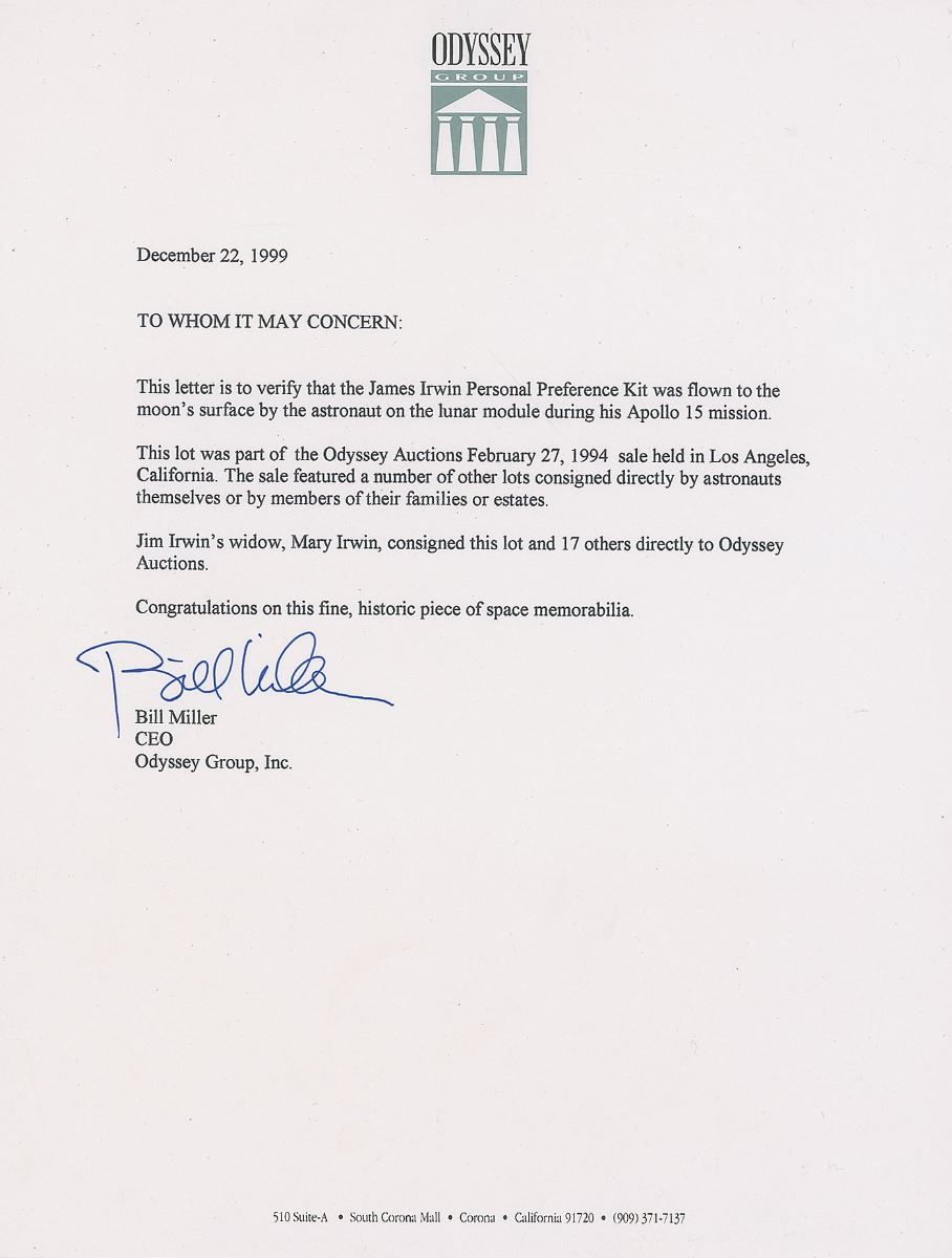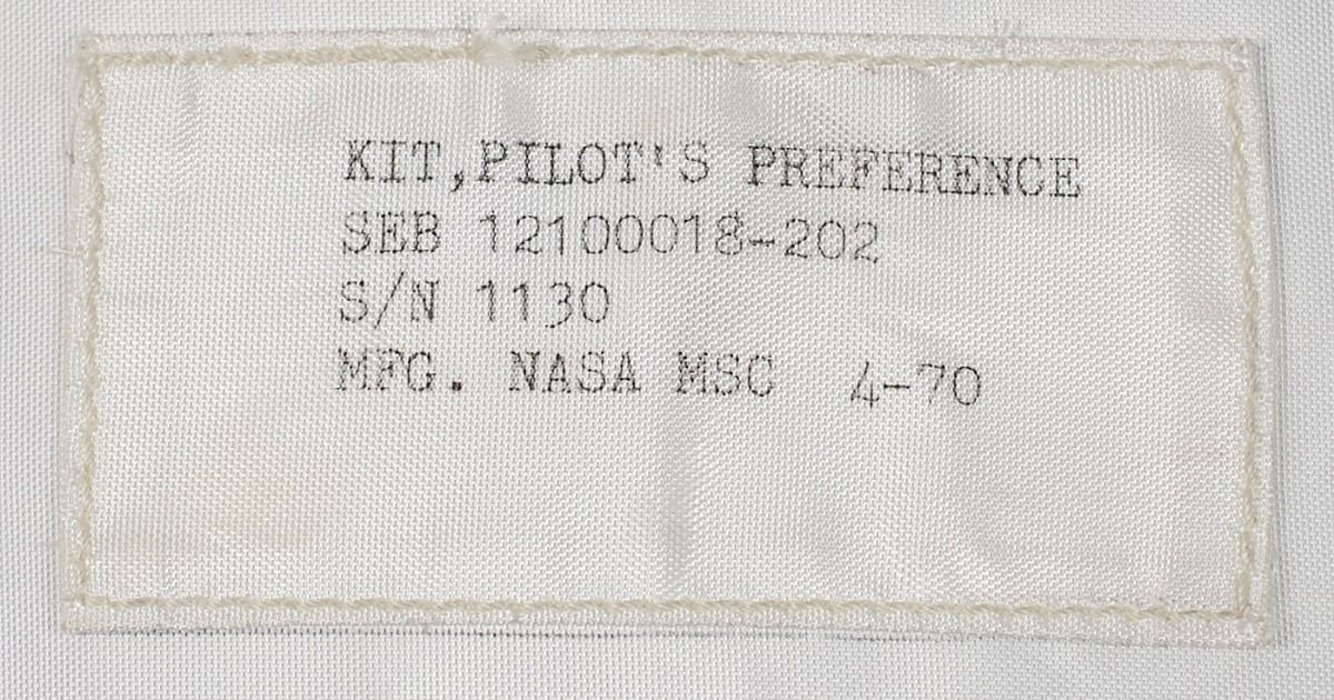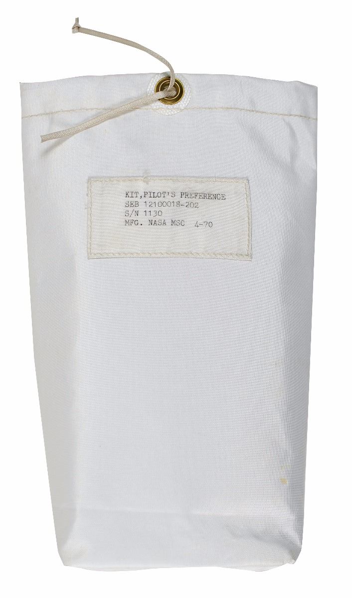 Jim Irwin’s flown Personal Preference Kit (PPK) beta cloth bag, 5.75 x 9, carried into lunar orbit aboard the Command Module Endeavor. The PPK has a patch on the front labeled: “Kit, Pilot’s Preference, SEB 12100018-202, S/N 1130, Mfg. NASA MSC 4-70.” In fine condition, with expected scattered marks from use. Originally sold in the 1994 Odyssey sale of Irwin’s estate. Especially scarce, PPKs allowed the Apollo astronauts to carry a limited number of personal items on each manned spacecraft flight. The Leon Ford Collection.