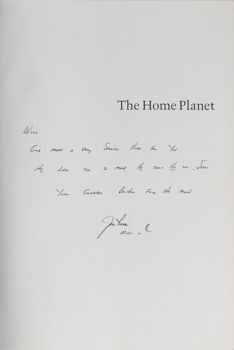 Signed book: The Home Planet. First edition. Moscow: Mir Publishers, 1988. Hardcover with dust jacket, 10.5 x 14.25, 165 pages. Signed and inscribed on the half-title page in black ink, “Will, God made a very special home for you. He loves you so much, he sent his son, Jesus. Your grateful brother from the moon, Jim Irwin, Apollo 15,” adding a small crescent moon. In fine condition, with a small tear to dust jacket.