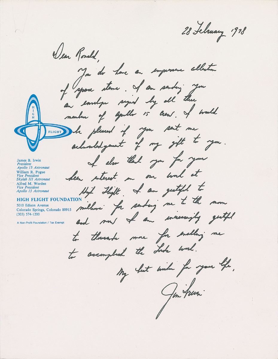 ALS, one page, 8.5 x 11, High Flight Foundation letterhead, February 28, 1978. Letter to Ronald, in full: “You do have an impressive collection of space items. I am sending you an envelope signed by all three members of Apollo 15 crew. I would be pleased if you sent me acknowledgment of my gift to you. I also thank you for your keen interest in our work at High Flight. I am grateful to millions for sending me to the moon and now I am increasingly grateful to thousands more for enabling me to accomplish the Lord’s work.” In fine condition.