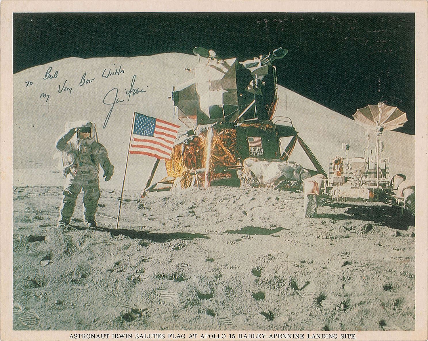 Official color 10 x 8 NASA lithograph of Irwin saluting the American flag on the lunar surface, signed and inscribed in black felt tip, "To Bob, My Very Best Wishes, Jim Irwin.” In fine condition, with light surface scuffing to upper right and mild corner creasing.