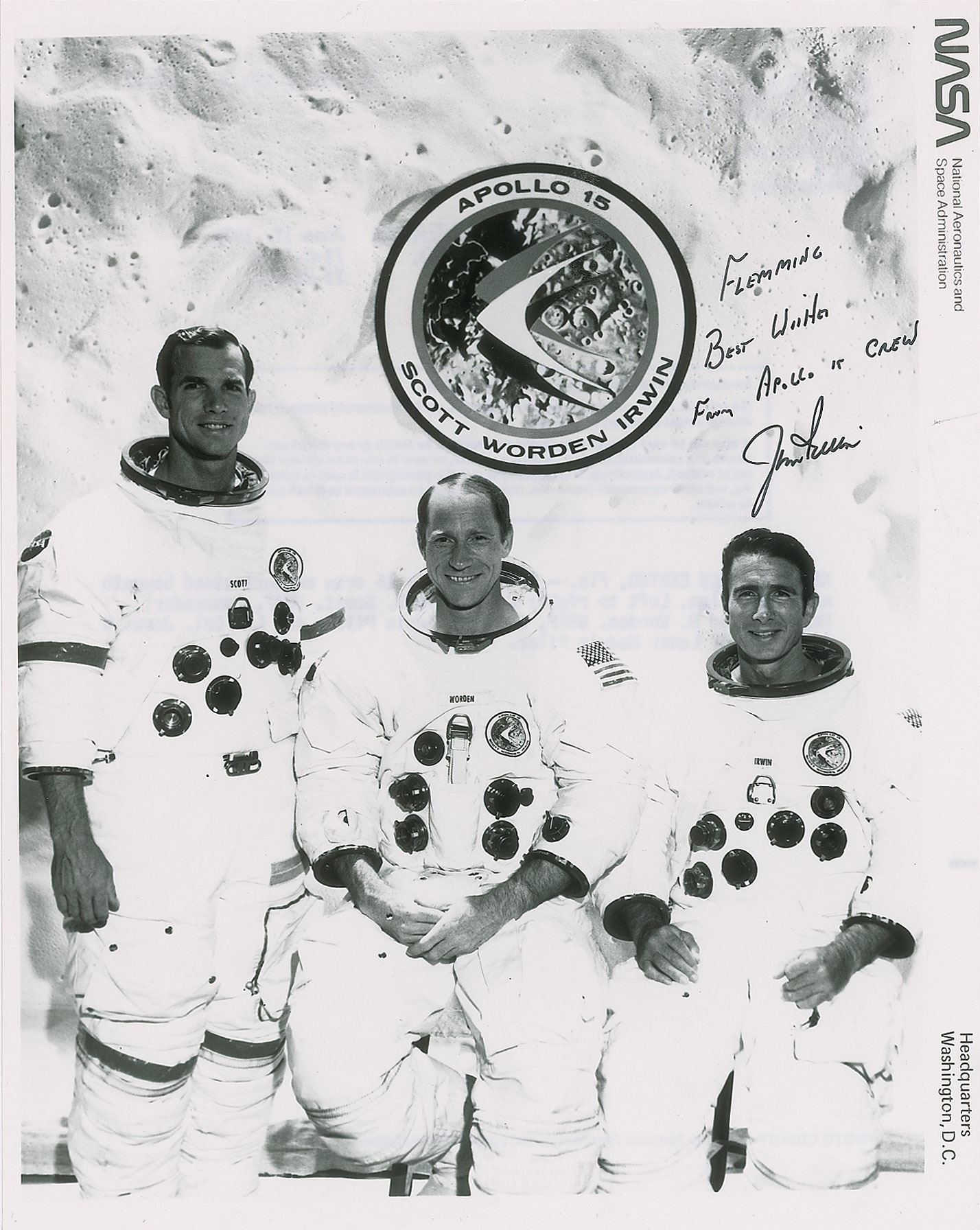 Official glossy 8 x 10.25 NASA photo of the Apollo 15 crew posing in their white space suits, signed and inscribed in black felt tip, "Flemming, Best Wishes From Apollo 15 Crew, Jim Irwin.” Reverse bears purple NASA caption text. In fine condition.