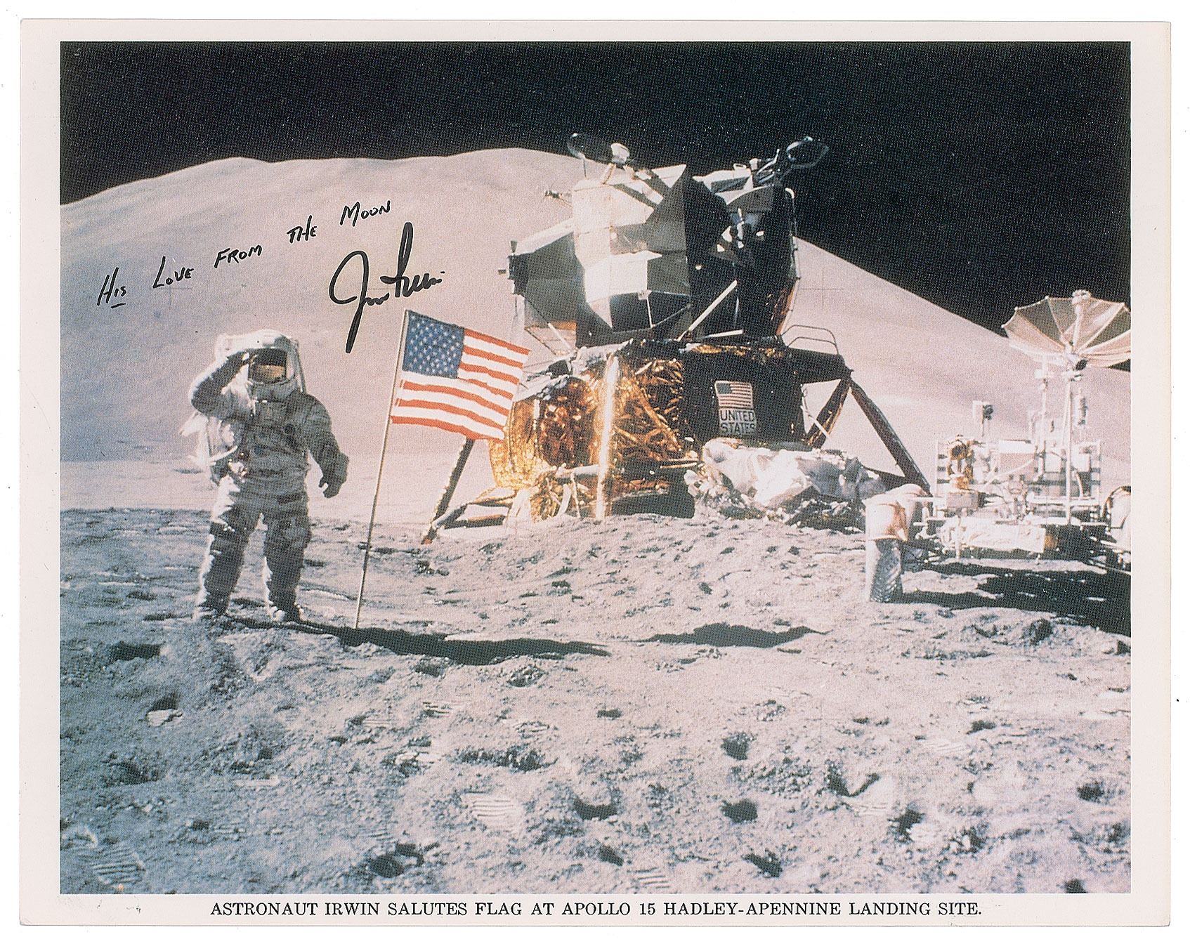 Official color 10 x 8 NASA lithograph of Irwin saluting the American flag at the Apollo 15 landing site, signed in black felt tip, "Jim Irwin," with a pre-printed "His Love from the Moon" sentiment above. In very fine condition.