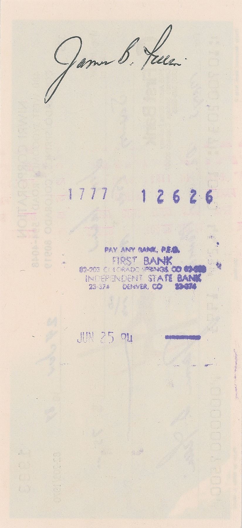 Triple-signed Niwri Corporation business check, 6 x 2.75, filled out and signed by Irwin, "James B. Irwin," payable to "Jim Irwin" for $75, June 24, 1984, and endorsed on the reverse, "James B. Irwin." In fine condition.