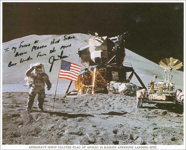 Color 10 x 8 NASA photo of Irwin saluting the flag on the lunar surface, signed and inscribed in black felt tip “To my friend at August Martin High School, Best wishes from the moon, Jim Irwin.” In fine condition. Pre-certified Scott Cornish and RRAuction COA.