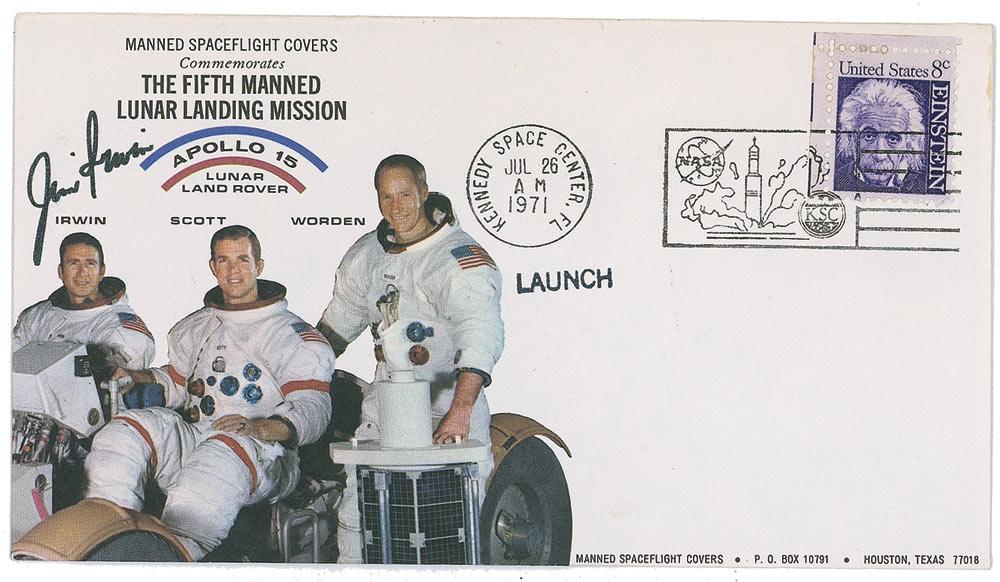Apollo 15 commemorative launch cover with a cachet honoring the Apollo 15 mission, signed in the upper left corner in black felt tip by Irwin. In very fine condition. Pre-certified Scott Cornish and RRAuction COA.
