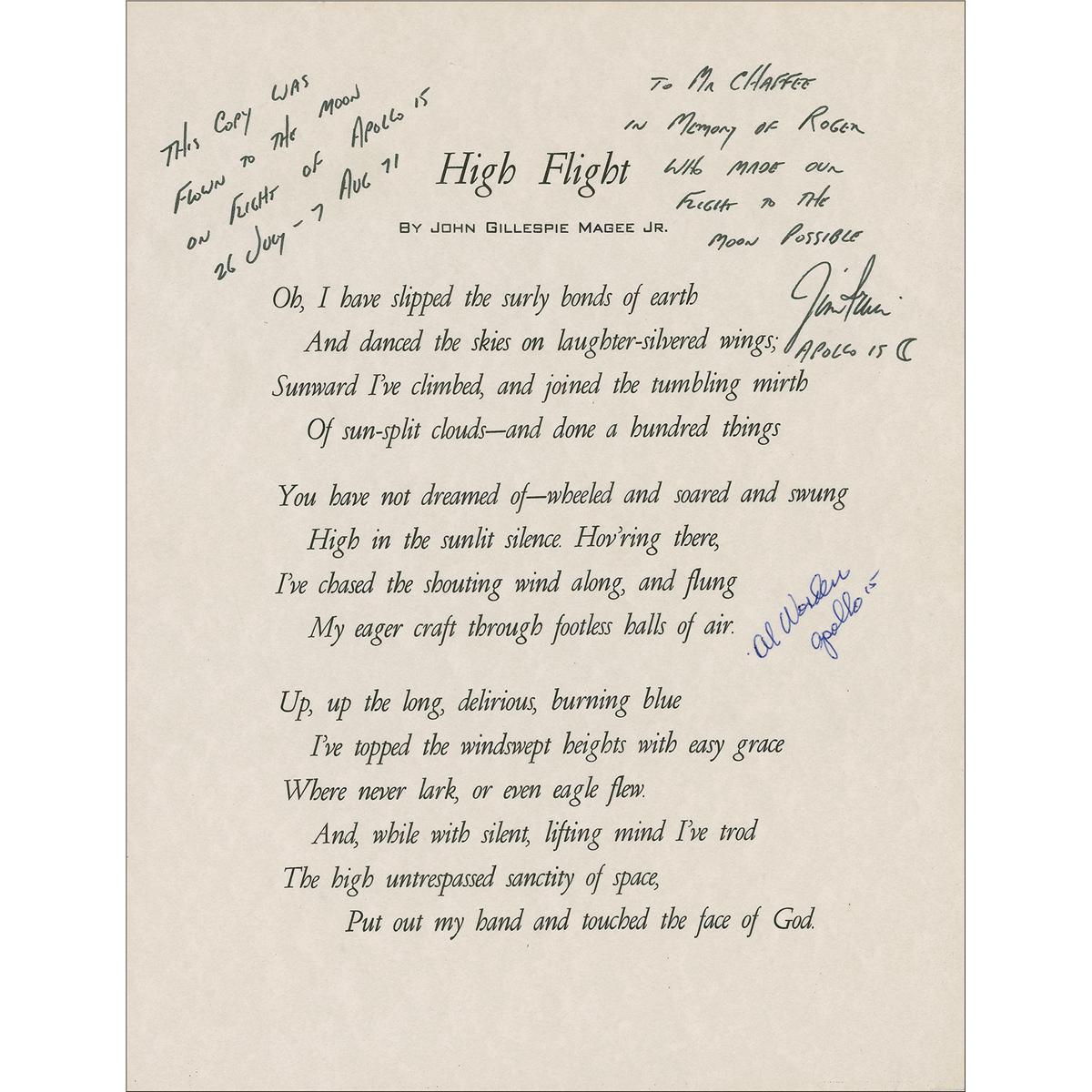 Flight-flown printed poem entitled ‘High Flight’ by John Gillespie Magee, Jr., one page, 8.5 x 11, signed and inscribed at the top in black felt tip, “This copy was flown to the moon on flight of Apollo 15, 26 July—7 Aug 71, To Mr. Chaffee in memory of Roger who made our flight to the moon possible, Jim Irwin, Apollo 15,” and also signed in blue ballpoint at a later date, “Al Worden, Apollo 15.” The three stanza, 14-line poem begins: “Oh, I have slipped the surly bonds of earth / And danced the skies on laughter-silvered wings; / Sunward I’ve climbed, and joined the tumbling mirth / Of sun-split clouds – and done a hundred things.”