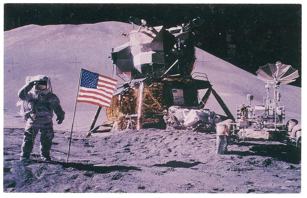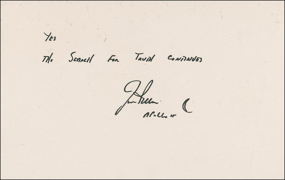 Color 5.5 x 3.5 cardstock photo of Irwin saluting the American flag on the lunar surface, signed on the back in black felt tip, “Yes, The search for Truth continues. Jim Irwin, Apollo 15,” adding a small sketch of a crescent moon after his signature. In fine condition, with a vertical crease to left side of image, not affecting signature.