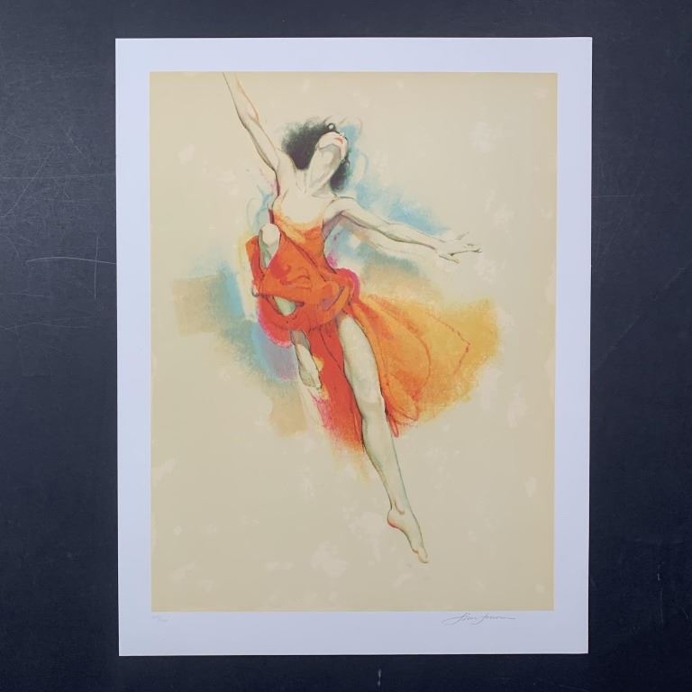 Jim Jonson's "Ballet II" limited edition print, signed lower right and numbered 168/300 lower left. This piece is of a ballerina, mid pose, wearing a pink, red and orange tutu. This piece is in excellent condition.