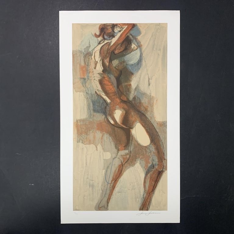 Jim Jonson's "Dance I" limited edition print, signed lower right and numbered 134/300 lower left. This piece is of the back and side and a nude woman, done in a figurative type style. This piece is in near excellent condition with a very small miniscule crease lower left corner, minor wrinkle/crease upper left corner, and miniscule small crease upper right corner.