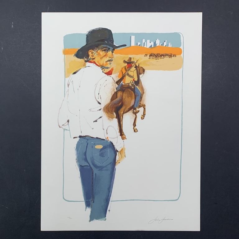 Jim Jonson's "Desperado" limited edition print, signed lower right, and numbered 107/300 lower left. This piece is of a closeup of a cowboy, who is facing off into the distance, but has his head turned around. There is also another cowboy riding a horse. This piece is in excellent condition with a miniscule wrinkle at bottom.