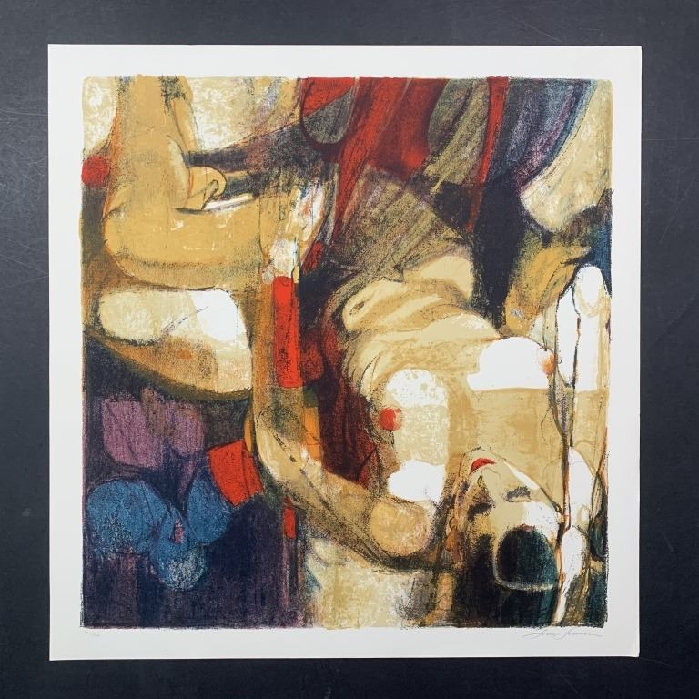 Jim Jonson's "Figure and Composition" limited edition print, signed lower right and numbered 105/300 lower left. This piece is a nude woman, lying down, done in an almost abtract like style. This piece is in excellent condition.