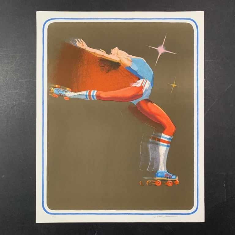Jim Jonson's "Roller Rocket" limited edition print, signed lower right and numbered 14/300 lower left. This piece is of a woman rolling skating, mid pose, with her back leg outstretched, and her back arched. This piece is in excellent condition.