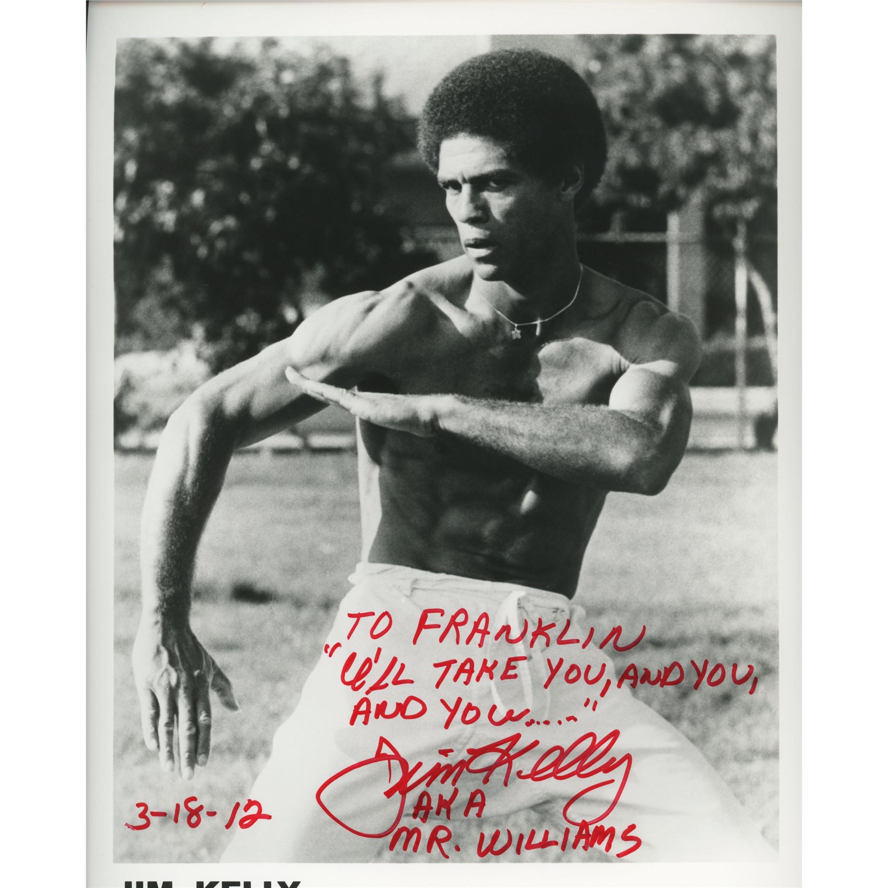 Jim Kelly signed photo. 8x10 inches