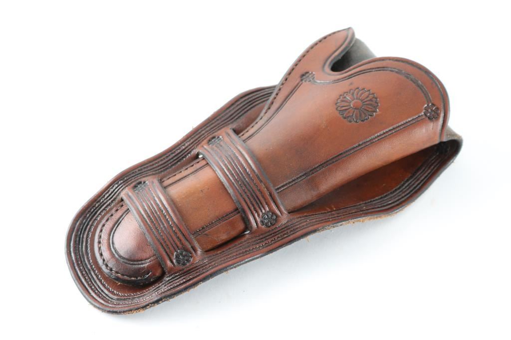 Authentic never used hand carved Jim Laird 'Cheyenne' holster and original pristine copy of his book the 'Cheyenne Saddle'. Holster will fit a 4 3/4" or 5 1/2' Colt Peacemaker. The maker's brand 'J.R. Laird, Santa Fe, NM., is hand carved under the inside toe of the holster. 'The Cheyenne Saddle', is a historical study of numerous leather craftsman from Cheyenne Wyoming during the late 1880's. Jim Laird's signature is on page 2 of his book. A copy of Jim Laird's obituary and widows letter, is enclosed with the book