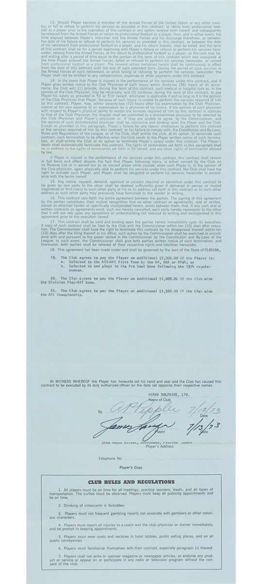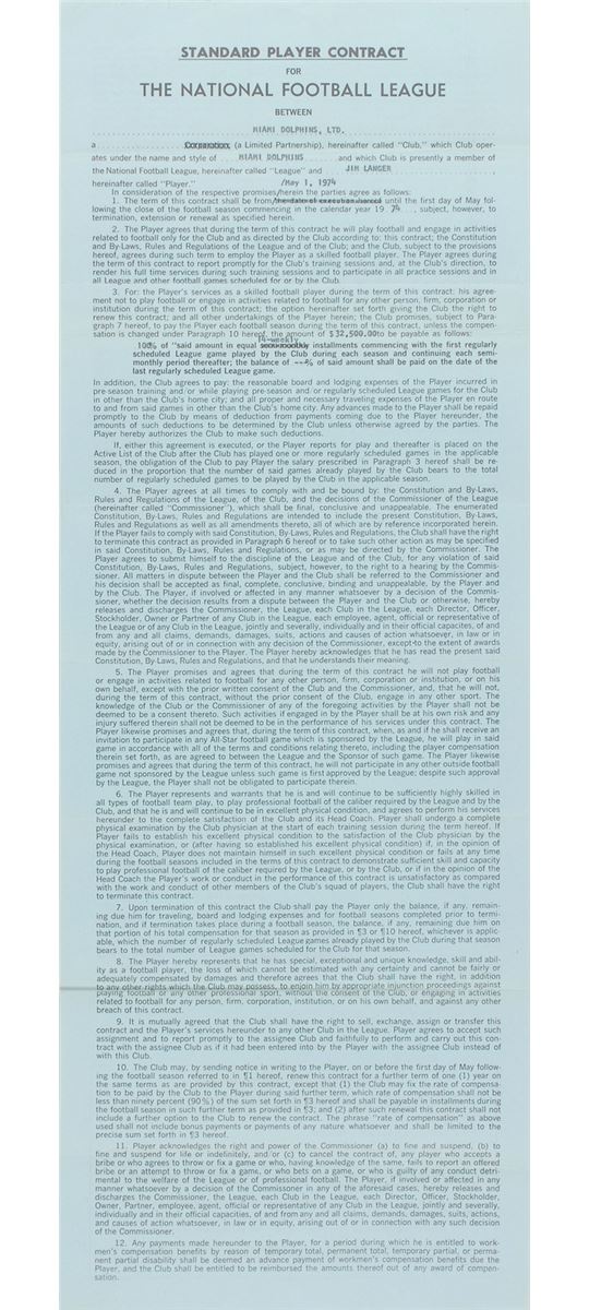 Football Hall of Famer who began his illustrious career as starting center for the Miami Dolphins in their 1972 undefeated season. DS, signed “James Langer, 7/13/73,” one page both sides, 8.5 x 23.5, July 13, 1973. Standard NFL players’ contract between Langer and the Miami Dolphins for the 1974 season, for a salary of $32,500. Signed at the conclusion by Langer and countersigned by Dolphins executive Pat Peppler. In fine condition, with several horizontal folds.