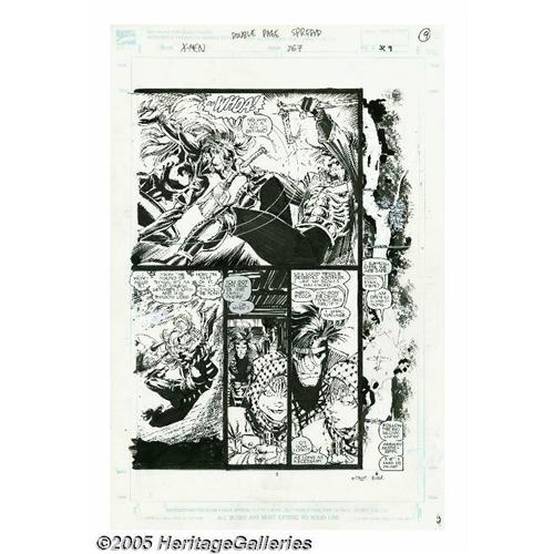 <B>Jim Lee, Whilce Portacio, and Scott Williams - The Uncanny X-Men #267, Double Page Spread, pages 8 and 9 Original Art (Marvel, 1990).</B></I> Minions of the Shadow King try to put the moves on Gambit, in this double-page spread from the Chris Claremont story, ""Nanny: Into the Fire"". Known for his stylized, detailed and dynamic style, penciler Jim Lee remains one of the most popular illustrators in comics, and with help by fellow penciler Whilce Portacio, and inker Scott Williams, we have the makings of two classic pages. These pages hail from Jim Lee's first issue as regular penciler on the series. The image area of the combined pages measures 21.5"" x 15"" and the work is in Excellent condition. <BR><BR><B>Important notice:</B> Heritage usually auctions material at the rate of 200-250 lots per hour. On some occasions eBay Live bid software or the Internet may not be able to keep up with the pace of the auction. We recommend placing a realistic absentee bid now as insurance to avoid disappointment. Occasionally the auctioneer may eliminate or reject an eBay Live bid, and the auctioneer may also reopen a lot after the close of the eBay live bidding (usually because we missed an audience bid), and may reject your bid even if it shows you as the winning bidder. By bidding via eBay Live, you agree that Heritage may award the lot to another bidder at its sole discretion under the circumstances described above or any other reasonable circumstances. Since eBay bids are not shown to us until we open the lot on the floor, we treat those bids just like floor bids. In most cases the floor responds before the eBay bid is presented to us, due to Internet lag time, so for consistency we have made it a policy that floor bids are always considered first over tie eBay live bids. Also please note that all Heritage lots purchased through eBay Live carry a 20% Buyer's Premium. Please make sure you read the Terms and Conditions before you bid. This lot is being auctioned in conjunc
