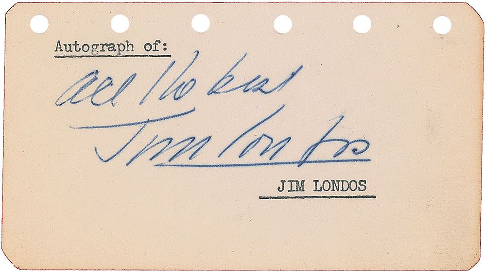 Wrestler known as ‘The Golden Greek’ who was especially popular during the Great Depression (1897–1975). Ballpoint signature, “All the best, Jim Londos,” on an off-white 4.5 x 2.5 page. In fine condition.