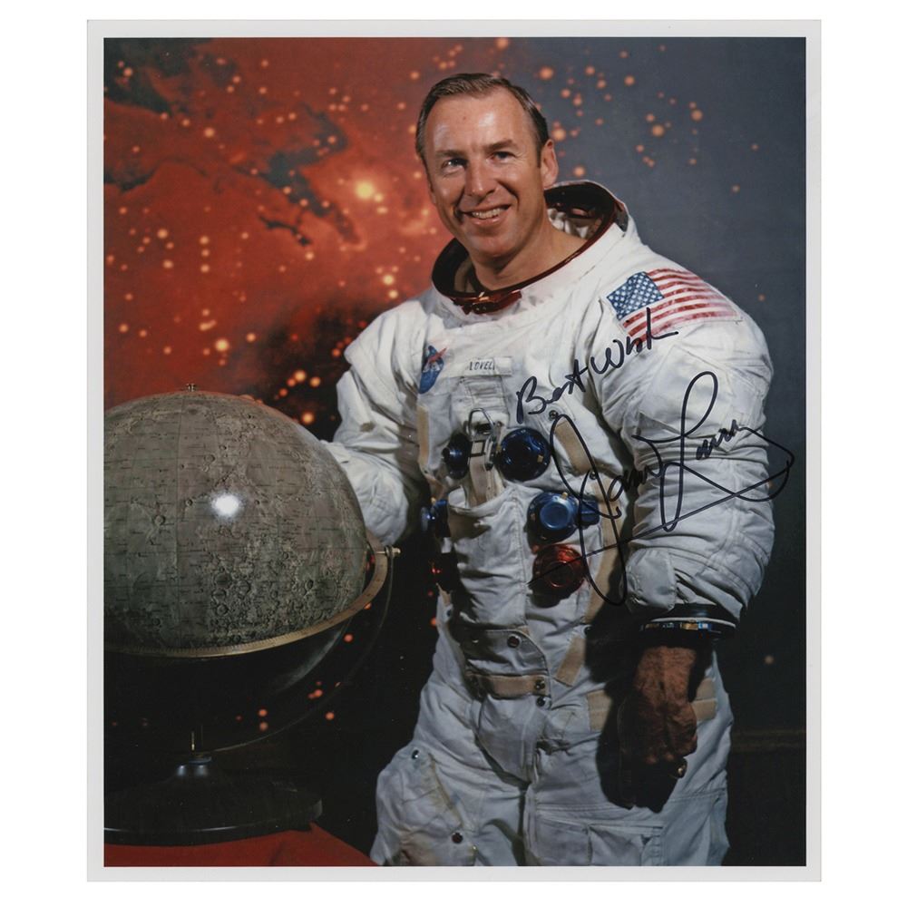 Color satin-finish 8 x 10 photo of Lovell in his white space suit, signed in black felt tip, "Best wishes, James Lovell." In fine condition.
