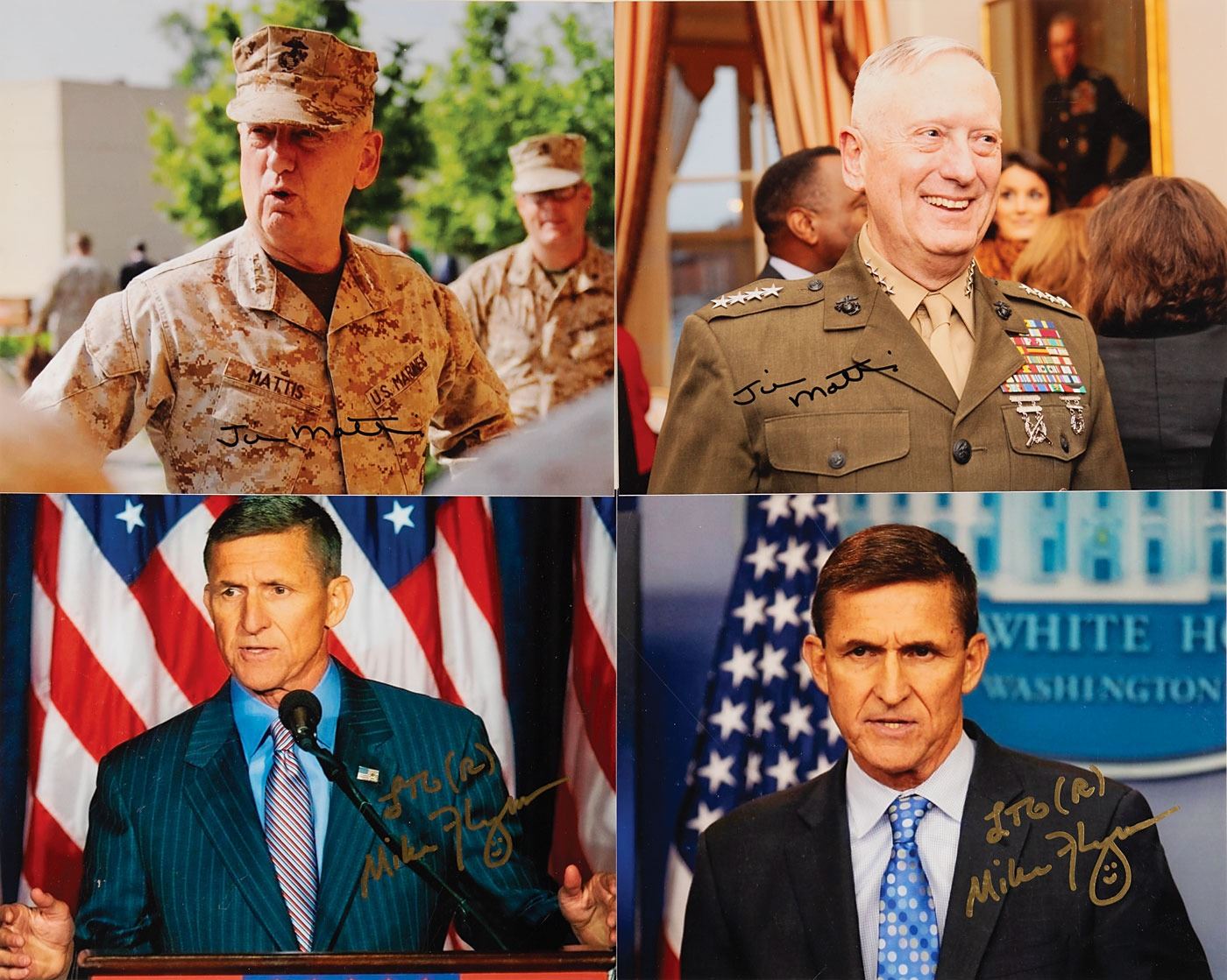 Four color glossy 10 x 8 photos, two of which picture former U.S. Secretary of Defense General Jim Mattis, and the other two picturing former National Security Advisor Lieutenant General Michael Flynn, each signed in black felt tip or gold ink. In overall fine condition.