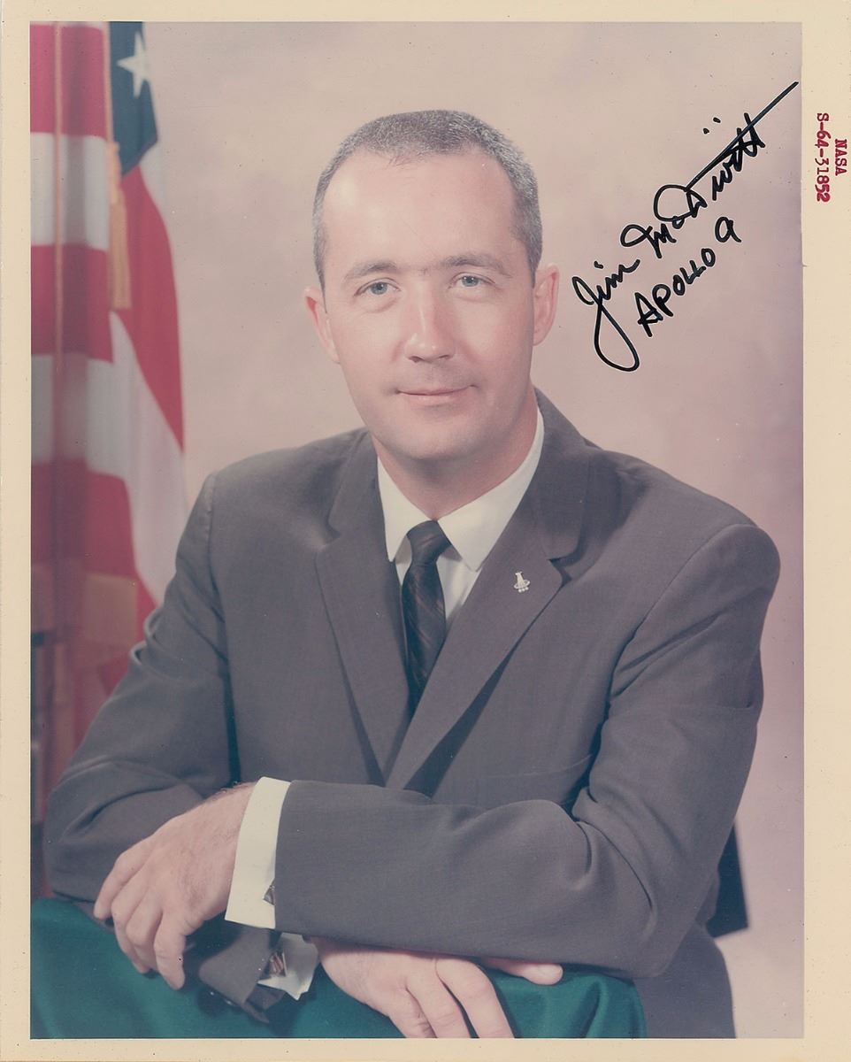 Official color glossy 8 x 10 red-numbered NASA photo of McDivitt in a suit and tie, signed in black felt tip, “Jim McDivitt, Apollo 9.” In fine condition.