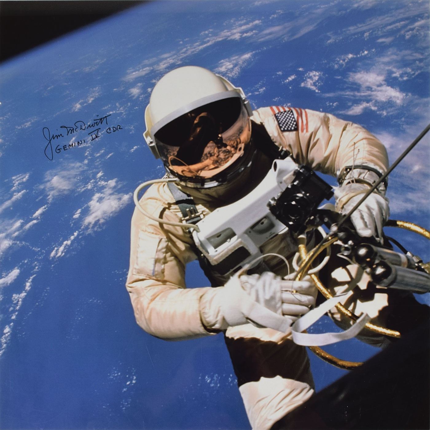 Color satin-finish 20 x 20 photo taken by McDivitt during Gemini 4, showing Ed White conducting the first American EVA, signed in black felt tip, "Jim McDivitt, Gemini IV CDR." In fine condition, with one small, trivial crease to the left edge.