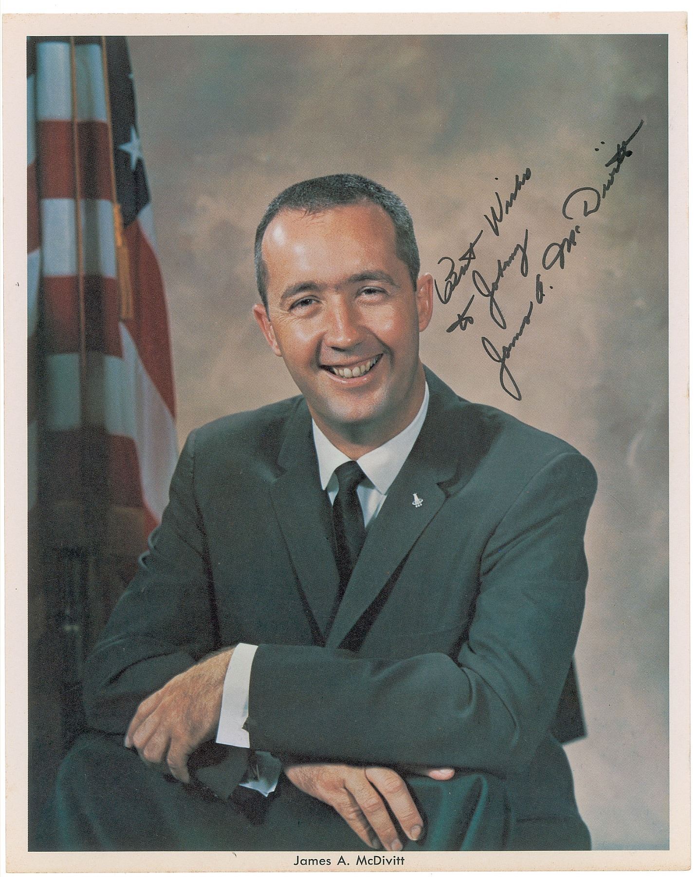 Official color 8 x 10 NASA lithograph of the Apollo 9 commander in a formal half-length pose, signed and inscribed in black felt tip, "Best wishes to Johnny, James A. McDivitt.” In very fine condition.