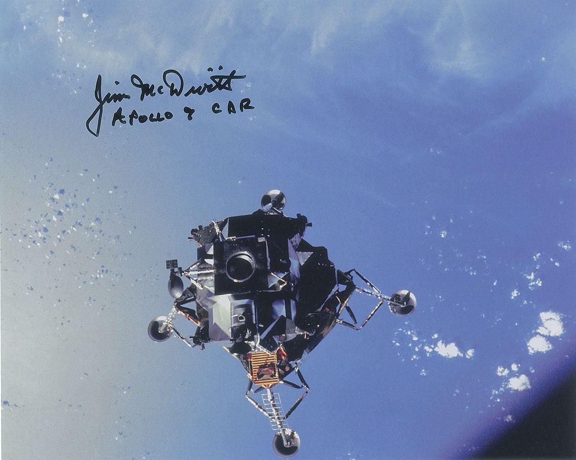 Uncommon color satin-finish 10 x 8 photo of the lunar module floating high above the Earth, signed in black felt tip, "Jim McDivitt, Apollo 9 CDR." In fine condition.
