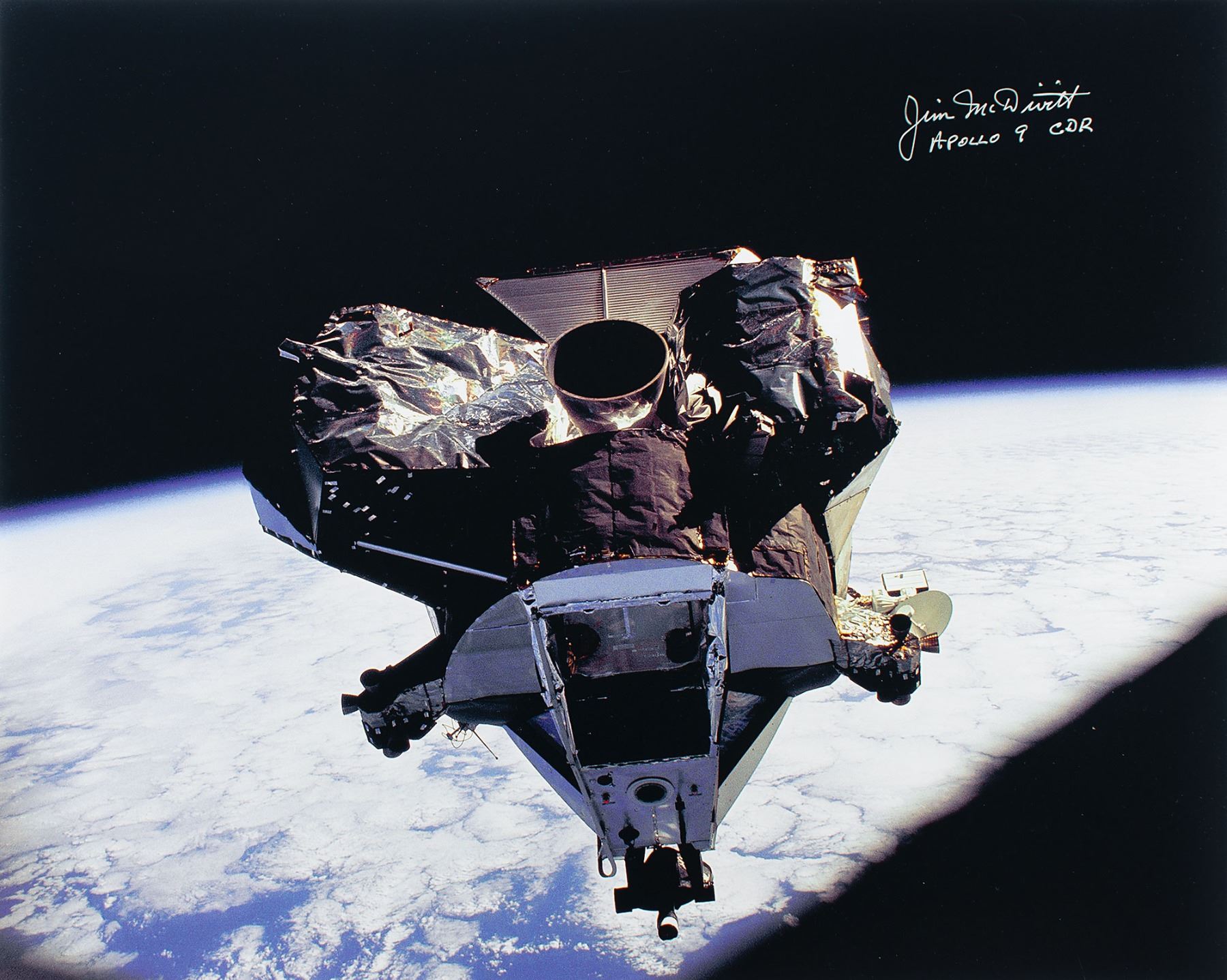Color satin-finish 20 x 16 photo of the Lunar Module Spider as viewed from the Command Module Gumdrop during the Apollo 9 rendezvous, signed in silver ink, "Jim McDivitt, Apollo 9 CDR." In fine condition.