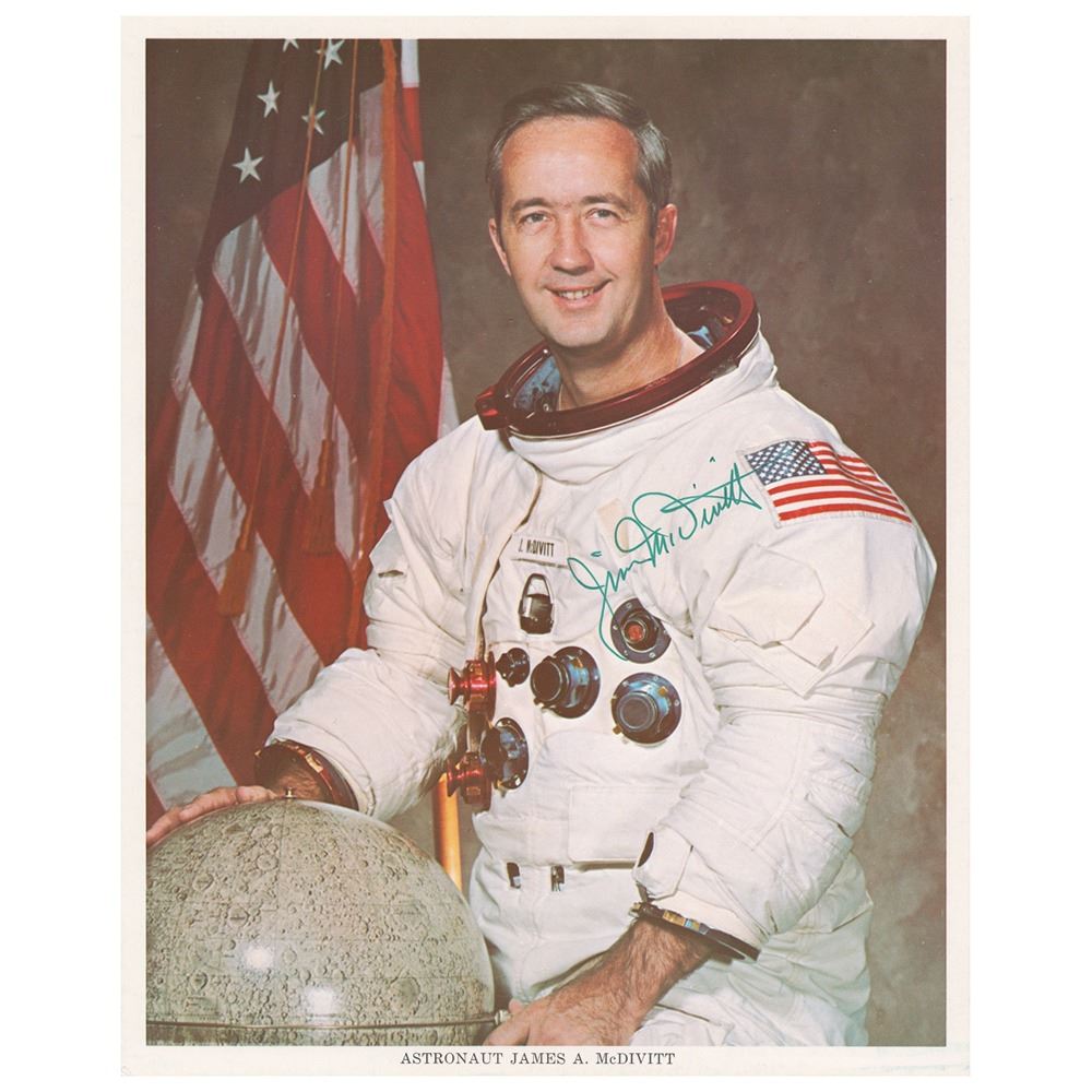 Official color 8 x 10 NASA lithograph of McDivitt posing in his white space suit with a lunar globe, signed in green felt tip, "Jim McDivitt." In fine condition.