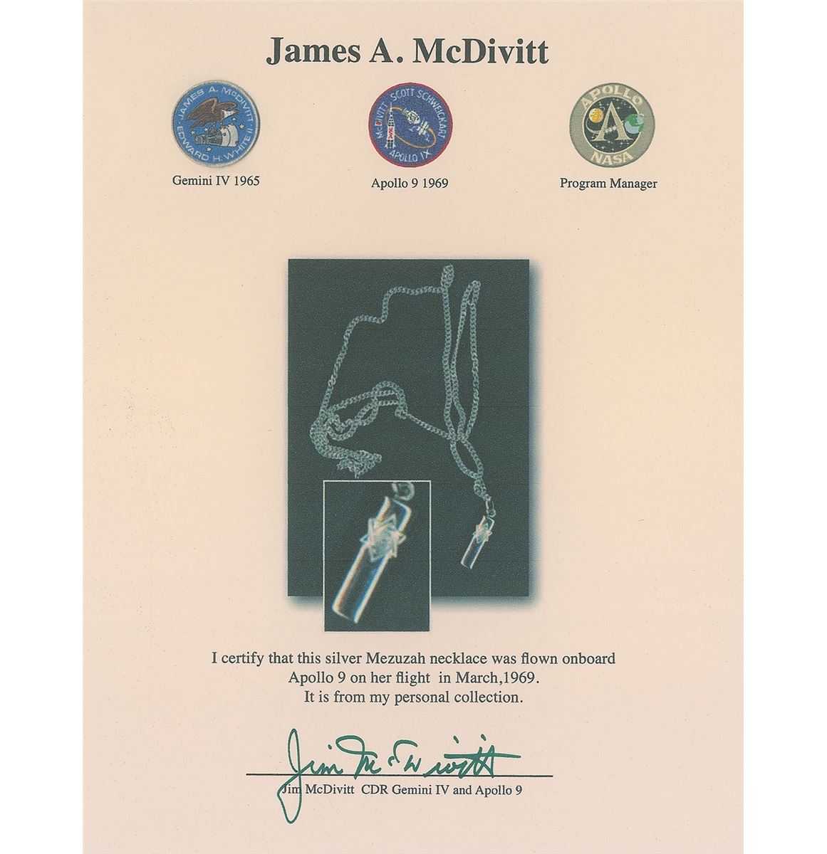 Flown sterling silver Jewish necklace carried into space on the Apollo 9 mission, with a .75? mezuzah charm suspended from the 23? long chain. In fine condition. Accompanied by a signed certificate of authenticity from McDivitt, in full: “I certify that this silver Mezuzah necklace was flown onboard Apollo 9 on her flight in March, 1969. It is from my personal collection.” The mezuzah is a parchment inscribed with Hebrew verses from the Torah and contained in a decorative case. While this case is sealed and thus not possible to verify the contents, it would traditionally hold the rolled piece of parchment with the verses of the Shema prayer. The mezuzah is affixed to the doorframe of Jewish homes in order to fulfill the mitzvah, or Biblical commandment, to have the prayer on the doorpost of the house. There were no Jewish astronauts on Apollo, and as far as we can ascertain this is the only known Jewish religious artifact ever to fly on an Apollo mission. A truly remarkable and stunning piece.